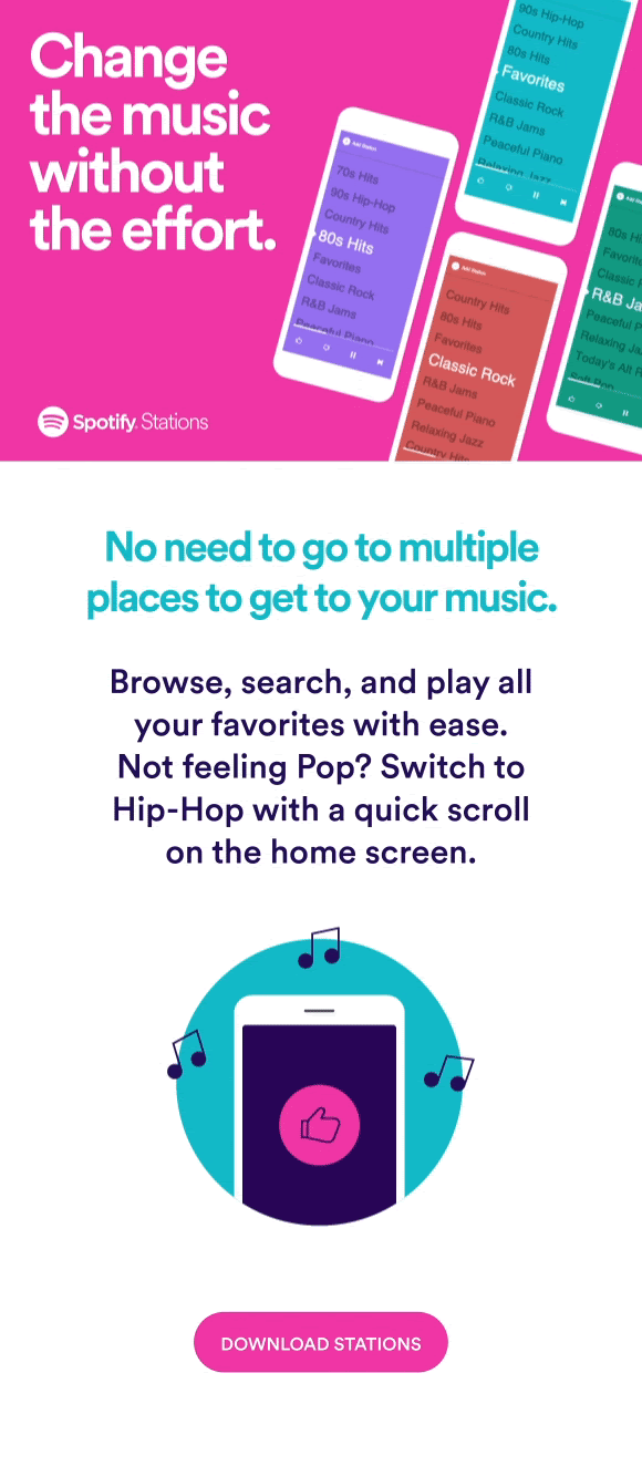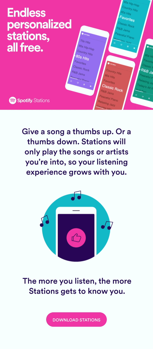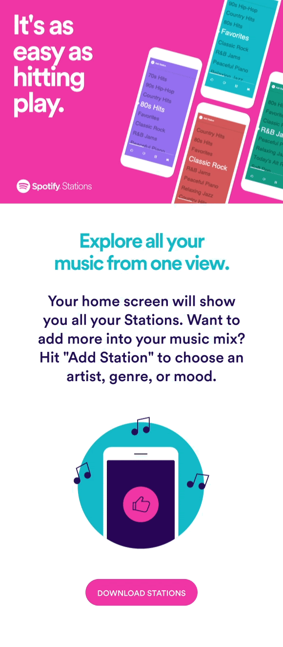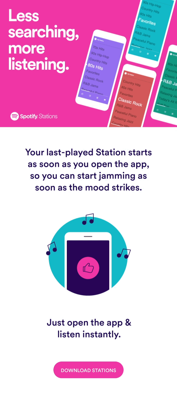 The world’s leading audio platform wanted to drive installs among lapsed users and non-users in the US for its newest product, Spotify Stations—a standalone app built for personalized radio streaming. I wrote and optimized emails and social ads around the app’s four key pillars: Personalization, Simplicity, Immediacy, and Zero Effort.